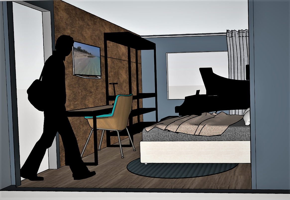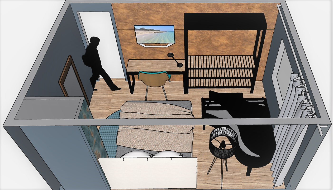 Johan wil een klassiek modern stijl in zijn slaapkamer zien. Zijn klassieke piano is een van de belangrijke elementen in de slaapkamer. Verder komt een nieuwe vloer, een bed, een openkast en een bureau. Voor deze twee laatste hebben wij een ontwerp gemaakt in een industrieel stijl. De wanden zijn bekleed met textielbehang in de kleuren bruin en turquoise.