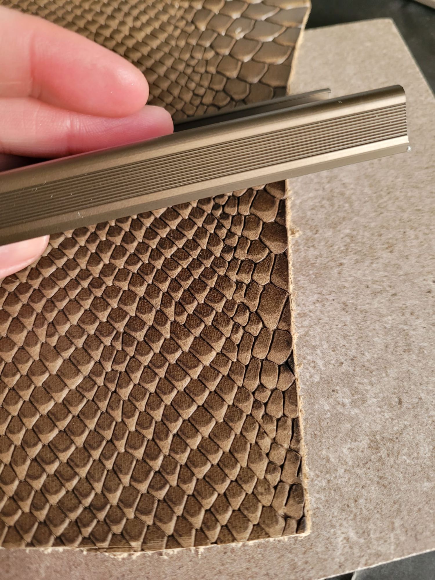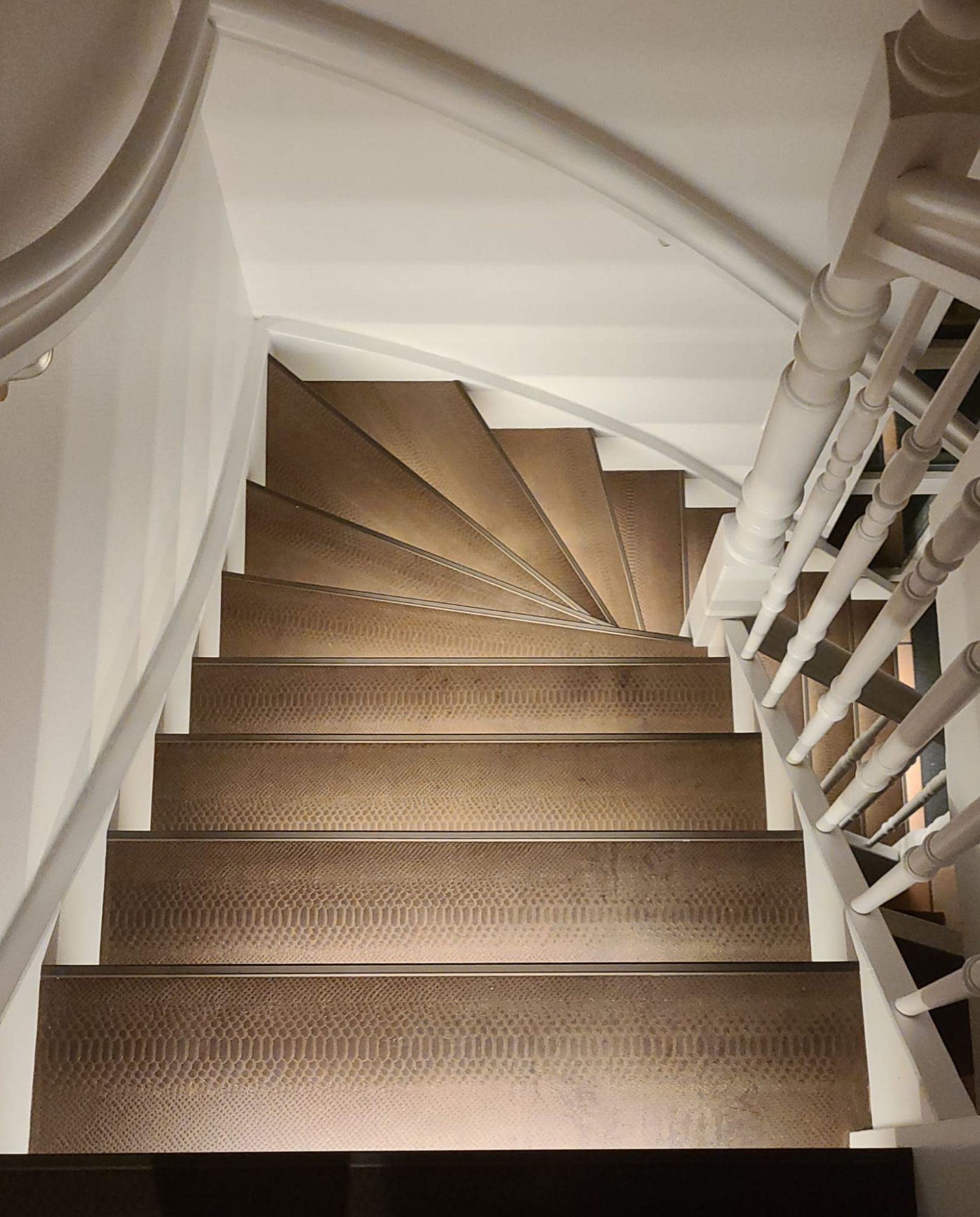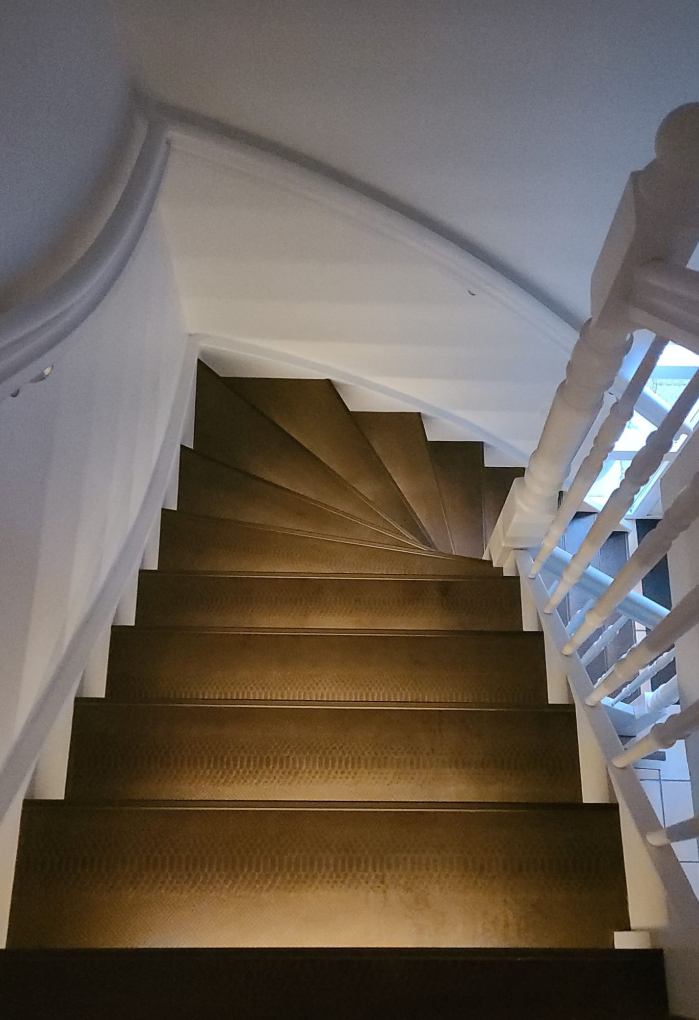 Trapbekleden met leer en aluminium profielen en led verlichting.